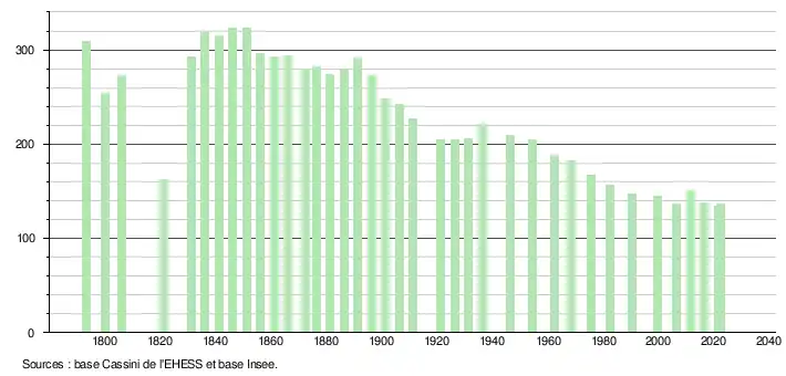 | L'évolution du nombre d'habitants est connue à travers les recensements de la population effectués dans la commune depuis 1793. Pour les communes de moins de 10 000 habitants, une enquête de recensement portant sur toute la population est réalisée tous les cinq ans, les populations de référence des années intermédiaires étant quant à elles estimées par interpolation ou extrapolation[24]. Pour la commune, le premier recensement exhaustif entrant dans le cadre du nouveau dispositif a été réalisé en 2006[25]. En 2022, la commune comptait 136 habitants[Note 3], en évolution de −1,45 % par rapport à 2016 (Hautes-Pyrénées : +1,59 %, France hors Mayotte : +2,11 %). |