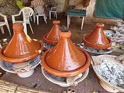 Le tajine marocain est un plat dont le récipient de préparation est appelé « tajine », c'est aussi un récipient de service en terre cuite, surmonté d'un couvercle souvent conique[34], triabgulaire (en forme de triangle), mais qui peut aussi être arrondi.