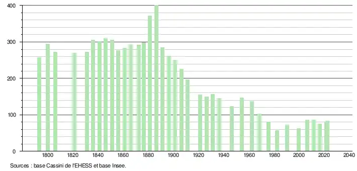 L'évolution du nombre d'habitants est connue à travers les recensements de la population effectués dans la commune depuis 1793. Pour les communes de moins de 10 000 habitants, une enquête de recensement portant sur toute la population est réalisée tous les cinq ans, les populations de référence des années intermédiaires étant quant à elles estimées par interpolation ou extrapolation[15]. Pour la commune, le premier recensement exhaustif entrant dans le cadre du nouveau dispositif a été réalisé en 2006[16].