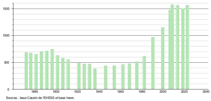 L'évolution du nombre d'habitants est connue à travers les recensements de la population effectués dans la commune depuis 1872. Pour les communes de moins de 10 000 habitants, une enquête de recensement portant sur toute la population est réalisée tous les cinq ans, les populations de référence des années intermédiaires étant quant à elles estimées par interpolation ou extrapolation[26]. Pour la commune, le premier recensement exhaustif entrant dans le cadre du nouveau dispositif a été réalisé en 2008[27].