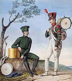 Sous la Restauration, la circulaire du 17 août 1814 restitue aux tambours la livrée bleue du roi avec des galons en fil blanc et laine cramoisie. Les 7 galons obliques sont rétablis en 1817. Deux décisions de 1827 réduisent les galons aux collets, parements et bas de taille. Le 31 octobre 1837, l'uniforme du tambour est aligné sur celui des autres soldats[1].