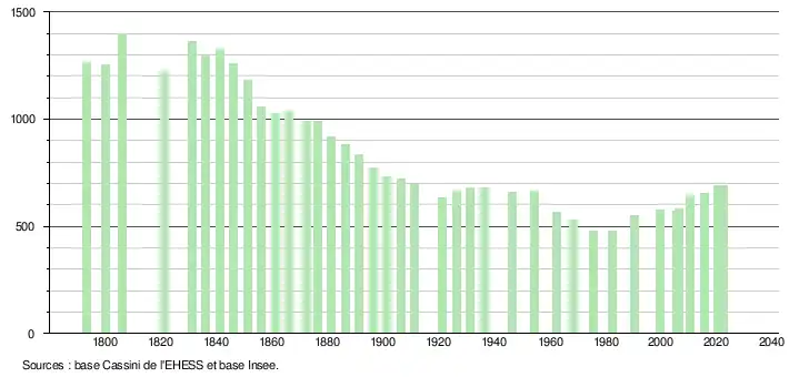 L'évolution du nombre d'habitants est connue à travers les recensements de la population effectués dans la commune depuis 1793. Pour les communes de moins de 10 000 habitants, une enquête de recensement portant sur toute la population est réalisée tous les cinq ans, les populations de référence des années intermédiaires étant quant à elles estimées par interpolation ou extrapolation[38]. Pour la commune, le premier recensement exhaustif entrant dans le cadre du nouveau dispositif a été réalisé en 2005[39].