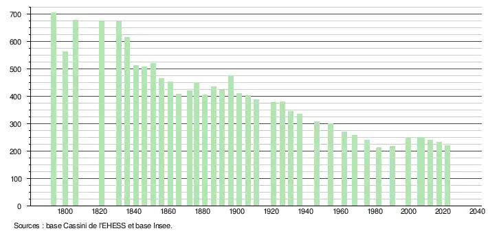 L'évolution du nombre d'habitants est connue à travers les recensements de la population effectués dans la commune depuis 1793. Pour les communes de moins de 10 000 habitants, une enquête de recensement portant sur toute la population est réalisée tous les cinq ans, les populations de référence des années intermédiaires étant quant à elles estimées par interpolation ou extrapolation[13]. Pour la commune, le premier recensement exhaustif entrant dans le cadre du nouveau dispositif a été réalisé en 2007[14].