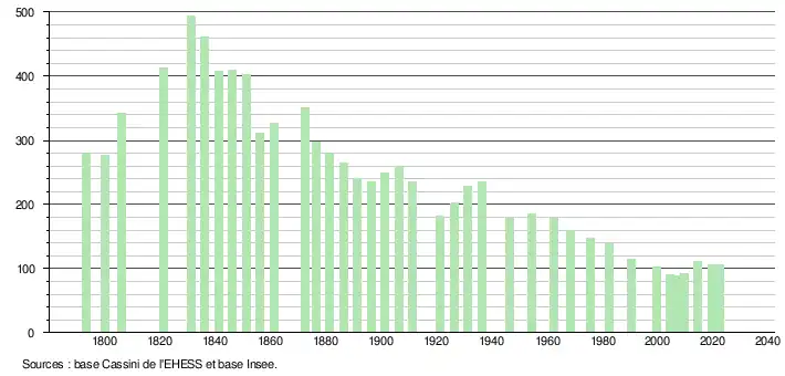 L'évolution du nombre d'habitants est connue à travers les recensements de la population effectués dans la commune depuis 1793. Pour les communes de moins de 10 000 habitants, une enquête de recensement portant sur toute la population est réalisée tous les cinq ans, les populations de référence des années intermédiaires étant quant à elles estimées par interpolation ou extrapolation[17]. Pour la commune, le premier recensement exhaustif entrant dans le cadre du nouveau dispositif a été réalisé en 2004[18].
