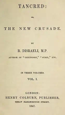 Tancred, ou The New Crusade (1847) est un roman de Benjamin Disraeli, publié pour la première fois par Henry Colburn (en) en trois volumes. Avec Coningsby (roman) (en) (1844) et Sybil (1845), il forme une trilogie parfois appelée la trilogie de Young England . Le roman partage plusieurs personnages avec les œuvres précédentes, mais, contrairement à celles-ci, il s'intéresse moins à la condition politique et sociale de l'Angleterre qu'à un thème religieux, voire mystique : la question de la réconciliation entre le judaïsme et le christianisme, et celle de la renaissance de l'Église comme force progressiste[1].