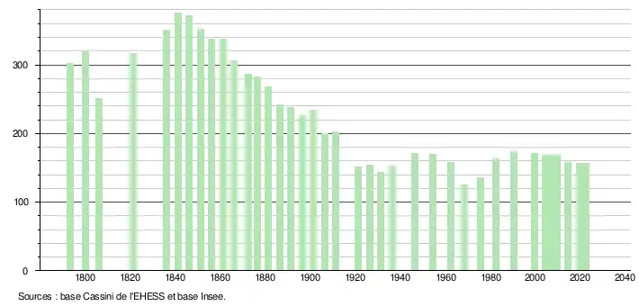 L'évolution du nombre d'habitants est connue à travers les recensements de la population effectués dans la commune depuis 1793. Pour les communes de moins de 10 000 habitants, une enquête de recensement portant sur toute la population est réalisée tous les cinq ans, les populations de référence des années intermédiaires étant quant à elles estimées par interpolation ou extrapolation[25]. Pour la commune, le premier recensement exhaustif entrant dans le cadre du nouveau dispositif a été réalisé en 2004[26].