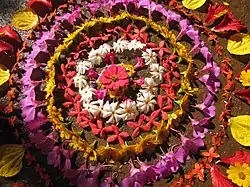 Dans l'État de Kerala, les seuils des maisons sont décorés de fresques florales colorées et de tapis de fleurs à l'occasion de la fête des moissons ou Onam. Ces réalisations sont appelées പൂക്കളം (pūkkaḷaṃ) en malayalam.