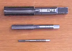 Pour le taraudage manuel, on utilise un tourne-à-gauche (ou une morille). Généralement, le taraudage à la main s'effectue en trois passes successives à l'aide d'un jeu de trois tarauds spécialisés appelés :