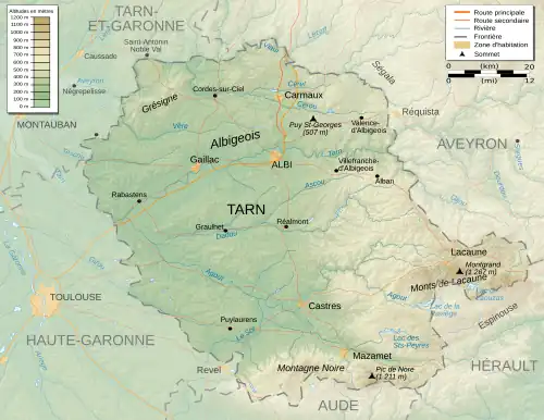 La partie sud-est du département est la plus élevée. Au sud, la montagne Noire présente une ligne continue abrupte qui sépare le Tarn de l'Aude. Elle atteint 1 211 m au pic de Nore. À l'est, le relief descend régulièrement des monts de Lacaune, plateau montagnard vers le Ségala, zone vallonnée et la rivière Viaur qui le coupe du Ségala aveyronnais. Au nord-ouest, la forêt de Grésigne occupe un point haut à 523 mètres à l'arbre de la Plane, proche d'un plateau calcaire qui constitue la pointe sud-est des causses du Quercy.