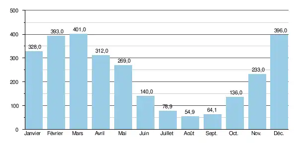 | Tarn | Mostuéjouls | 31,70 | 4,80 | 40,9 à 45,7 | 41,8 | 36,2 | 20,0 | 10,9 | 8,51 | 13,3 | 31,2 | 925 |