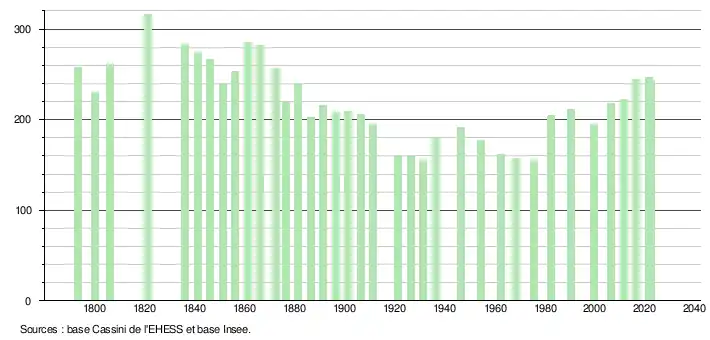 L'évolution du nombre d'habitants est connue à travers les recensements de la population effectués dans la commune depuis 1793. Pour les communes de moins de 10 000 habitants, une enquête de recensement portant sur toute la population est réalisée tous les cinq ans, les populations de référence des années intermédiaires étant quant à elles estimées par interpolation ou extrapolation[12]. Pour la commune, le premier recensement exhaustif entrant dans le cadre du nouveau dispositif a été réalisé en 2006[13].