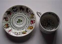 Bien que de nombreuses personnes préfèrent une simple tasse blanche pour lire les feuilles de thé, il existe également des traditions concernant la position des feuilles dans la tasse, et certains trouvent donc plus facile de travailler avec des tasses marquées. À partir de la fin du XIXe siècle et jusqu'à nos jours, les potiers anglais et américains ont produit des ensembles de tasses et de soucoupes spécialement décorées à l'usage des lecteurs de feuilles de thé. Beaucoup de ces modèles sont brevetés et sont accompagnés d’instructions expliquant leur mode d’utilisation. Les modèles les plus répandus étaient ceux qui étaient offerts lors de l'achat de thé en vrac.