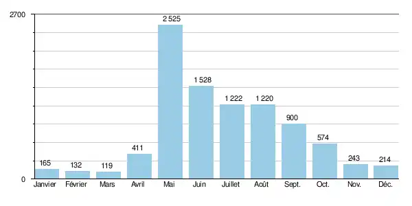 Le débit moyen mensuel observé en février (minimum d'étiage) est de 119 m3/s, soit moins de 5 % du débit moyen du mois de mai (2 525 m3/s), ce qui souligne la forte amplitude des variations saisonnières. Les écarts de débit mensuel peuvent être encore plus importants d'après les années : sur la durée d'observation de 50 ans, le débit mensuel minimal a été de 57,7 m3/s en , tandis que le débit mensuel maximal s'élevait à 4 450 m3/s en . En ce qui concerne la période libre de glace (de mai à octobre inclus), le débit minimal observé a été de 355 m3/s en .