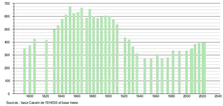 L'évolution du nombre d'habitants est connue à travers les recensements de la population effectués dans la commune depuis 1793. Pour les communes de moins de 10 000 habitants, une enquête de recensement portant sur toute la population est réalisée tous les cinq ans, les populations de référence des années intermédiaires étant quant à elles estimées par interpolation ou extrapolation[15]. Pour la commune, le premier recensement exhaustif entrant dans le cadre du nouveau dispositif a été réalisé en 2005[16].