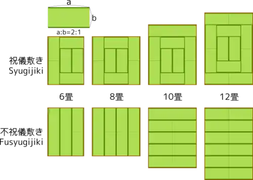 Les tatamis « traditionnels » vendus dans les magasins occidentaux présentent généralement des dimensions de 70/80/90 × 200 cm, non-conformes au rapport 1:2. Il est donc impossible avec ces tatamis d'adopter une disposition shūgijiki (disposition dans les deux sens).