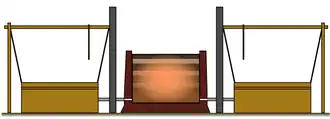 Dans sa dernière évolution, le fourneau ressemble à une grande baignoire rectangulaire d’environ 2,70 m de long sur 90 cm de large et d’une hauteur de 0,9 à 1,2 m pour la fabrication de l'acier, mais pouvant monter jusqu'à 1,6 m pour la fabrication de la fonte blanche[note 1]. La base du fourneau est, sur ses deux côtés les plus longs, criblée d’une vingtaine de trous dans lesquels s’emboîtent des tuyères métalliques permettant d’insuffler l’air propulsé par des soufflets. Un ou plusieurs orifices de coulée permettent l'évacuation partielle du laitier. Afin d’assécher le soubassement, le fourneau est bâti sur une infrastructure souterraine complexe construite en pierre, bois et argile. Cette fondation sert plusieurs années, contrairement au four lui-même qui doit être reconstruit à chaque campagne (chacune dure de trois à quatre jours)[1].