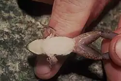 Taudactylus eungellensis mesure 35 mm. Son dos varie du brun verdâtre au brun foncé et présente une marque en forme de X et des marbrures foncées. Son ventre est jaunâtre.