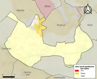 Le retrait-gonflement des sols argileux est susceptible d'engendrer des dommages importants aux bâtiments en cas d’alternance de périodes de sécheresse et de pluie. 6,2 % de la superficie communale est en aléa moyen ou fort (67,7 % au niveau départemental et 48,5 % au niveau national). Sur les 262 bâtiments dénombrés sur la commune en 2019, 25 sont en aléa moyen ou fort, soit 10 %, à comparer aux 72 % au niveau départemental et 54 % au niveau national. Une cartographie de l'exposition du territoire national au retrait gonflement des sols argileux est disponible sur le site du BRGM[27],[Carte 2].