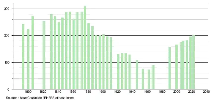 L'évolution du nombre d'habitants est connue à travers les recensements de la population effectués dans la commune depuis 1793. Pour les communes de moins de 10 000 habitants, une enquête de recensement portant sur toute la population est réalisée tous les cinq ans, les populations de référence des années intermédiaires étant quant à elles estimées par interpolation ou extrapolation[15]. Pour la commune, le premier recensement exhaustif entrant dans le cadre du nouveau dispositif a été réalisé en 2008[16].