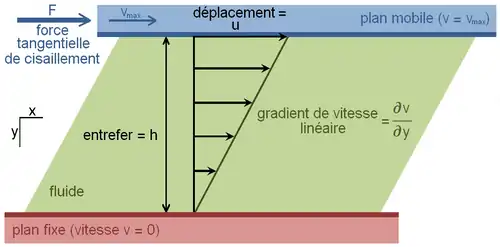Le gradient de vitesse dans le fluide est constant (= )[6] et perpendiculaire à la vitesse
