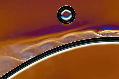 Un fluide s'écoule de droite à gauche le long d'une limite solide. Ce faisant, il subit un frottement avec elle, ce qui entraîne l'application d'une contrainte de cisaillement. Selon la condition de non-glissement, la vitesse de l'écoulement au contact de cette limite est égale à zéro, mais la vitesse augmente de 0 à v (v = la vitesse du fluide) à une certaine hauteur. La région située entre la frontière et cette hauteur est appelée couche limite et c'est dans cette couche que l'on peut observer la formation de tourbillons contrarotatifs dans l'écoulement. Agrandissement ×100