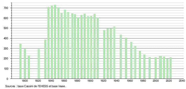 L'évolution du nombre d'habitants est connue à travers les recensements de la population effectués dans la commune depuis 1793. Pour les communes de moins de 10 000 habitants, une enquête de recensement portant sur toute la population est réalisée tous les cinq ans, les populations de référence des années intermédiaires étant quant à elles estimées par interpolation ou extrapolation[21]. Pour la commune, le premier recensement exhaustif entrant dans le cadre du nouveau dispositif a été réalisé en 2007[22].