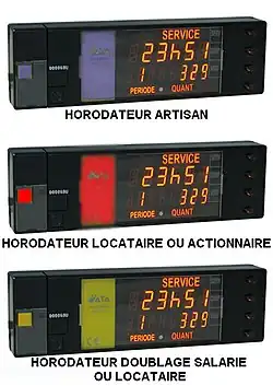 3 - Horodateur : il indique le quantième et l'heure de fin de service. Il est fixé sur la plage arrière du véhicule mais est directement intégré au compteur pour les modèles les plus récents. Il indique par sa couleur de fond le statut du chauffeur, bleu pour les artisans, rouge pour les actionnaires et les locataires, jaune pour les véhicules à deux sorties journalières (salarié ou locataire).