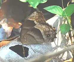 Le revers est marron avec une teinte rougeâtre de la bande submarginale ornée d'une ligne d'ocelles, discrets à l'aile antérieure, mieux visibles à l'aile postérieures avec celui proche de l'angle anal noir pupillé de blanc[3].