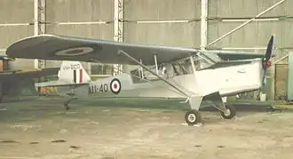 Un Taylorcraft Auster 5 « Air Observation Post » de 1957 à Keevil Airfield, dans le Wiltshire, en Angleterre. Cet exemplaire est détenu par un particulier et a été restauré aux couleurs de la Royal Air Force. | |