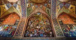 Sur les murs est et ouest, les niches supérieures sont entièrement remplies par deux peintures murales datant des Qajars: la victoire de Nāder Shāh sur l'empereur moghol Muhammad Shâh à l'est, et à l'ouest la bataille de Chaldoran qui vit la défaite du fondateur de la dynastie séfévide, Shāh Ismail, face aux Ottomans de Sélim Ier équipés de canons, défaite ressentie paradoxalement comme "l'acte fondateur d'une nation résistant à l'envahisseur" (Yves Bomati)[6]. Une bande de décorations sépare la peinture de la zone située en dessous. Cette zone est remplie de scène plus petites, avec peu de personnages.