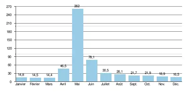 Le débit moyen mensuel observé en mars (minimum d'étiage) est de 14,4 m3/s, soit seulement 5,5 % du débit moyen du mois de mai (262 m3/s), ce qui souligne l'amplitude élevée des variations saisonnières. Sur la durée d'observation de 32 ans, le débit mensuel minimal a été de 8,7 m3/s en , tandis que le débit mensuel maximal s'élevait à 578 m3/s en . Un débit mensuel inférieur à 9,0 m3/s est exceptionnel.