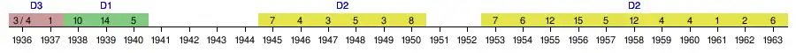 | 1993-1994 | 3e | 48 | 34 | 20 | 8 | 6 | 52 | 23 | +29 | Vainqueur | |