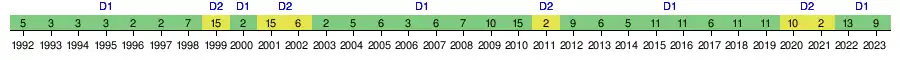 | 1995-1996 | 2e | 73 | 34 | 22 | 7 | 5 | 56 | 25 | +31 | Seizièmes de finale | |