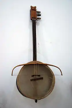Il est composé d’un « corps » en bois recouvert de cuir et d’un « cou » terminé par une « tête » portant le mécanisme de tension des cordes : elles sont au nombre de trois et correspondent à trois voix (débutante, haute et basse).