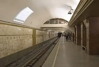 La station Teatralna est mise en service le [1]. La station est due aux architectes N. Alyoshkin, A. Krushinsky, T. Tselikovskaya et à l'artiste A. Kushch[2].