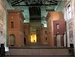 Scamozzi a, en outre, complètement abandonné les fronts de scène complexes d’inspiration classique qui constitue, à bien des égards, le trait caractéristique du Teatro Olimpico. La suppression de ce fond de scène rigide, qui l’avait forcé à construire sept scènes de rue séparées afin que tous les membres du public puissent voir au moins une partie du paysage, l'a mené à construire une vue en perspective unique d’une scène de rue. Les plans de Scamozzi pour ce paysage en trompe-l’œil sont clairement visibles dans le coin supérieur droit de ses plans pour le théâtre. L’illusion de grande distance a été obtenue par la diminution rapide de la taille de la fausse façade des bâtiments sur une distance resserrée. En tant que partie intégrante de l’illusion, le niveau du sol augmente rapidement pour permettre aux bâtiments de rétrécir verticalement, tandis que les deux côtés de la rue se referment horizontalement. On peut constater les deux caractéristiques de la conception de la scène, respectivement, sur le côté supérieur droit et le côté inférieur droit des plans de Scamozzi. Compte tenu de l’étroitesse de l’espace réservé aux places assises, une seule perspective suffisait à tous les membres de l’auditoire.