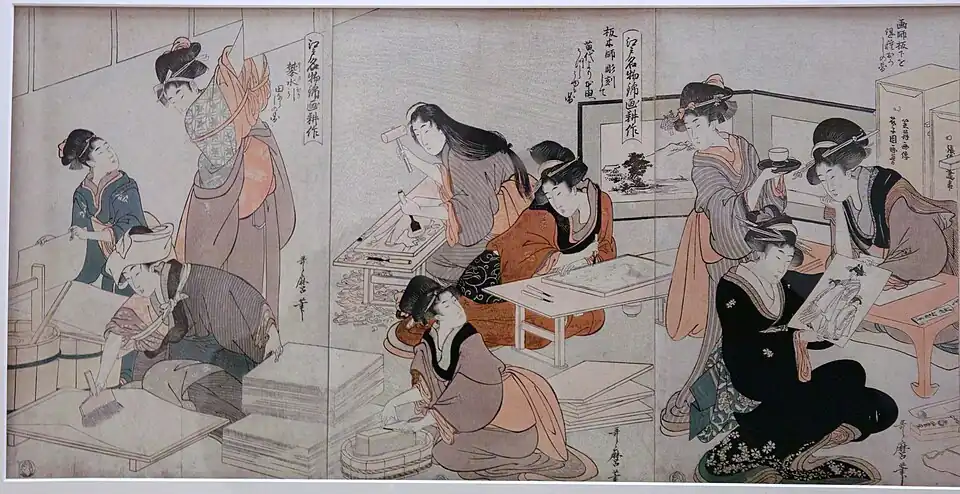 La fabrication d'une estampe japonaise ne fait pas seulement intervenir l'artiste ; le dessin qu'il a réalisé n'est que la première étape d'un processus complexe, faisant appel à plusieurs intervenants (l'artiste, l'éditeur, le(s) graveur(s), le ou les imprimeurs).
