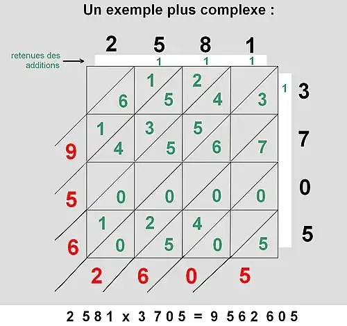 - ↑ Jacques Bon, « La multiplication Per gelosia », sur Académie de Grenoble,