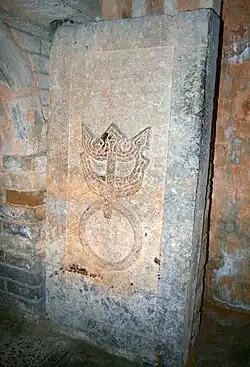 La disposition des tombes creusées à flanc de montagnes comprend en général une chambre avant, des chambres latérales et des chambres arrière, afin d'imiter les dispositions des maisons à la surface[170]. La tombe du Roi Liu Sheng dans la province du Hebei ne contient non seulement une pièce avant avec des rideaux aux fenêtres et du mobilier funéraire, mais également des chariots et chevaux dans la pièce latérale du sud et des marchandises stockées dans celle du nord. Elle contient même les restes de vraies maisons en bois avec un toit en tuiles[170]. Des portes entièrement réalisées en pierre sont découvertes dans de nombreuses tombes Han, ainsi que dans les ouvrages funéraires des dynasties postérieures[174].