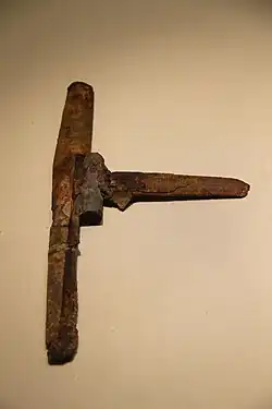 Donald B. Wagner écrit que les outils et instruments domestiques en fer sous la dynastie Han sont fabriqués à partir de fonte bon marché et plus fragile. Au contraire, le fer de meilleure qualité ainsi que l'acier sont principalement réservés aux usages militaires, en raison de leur plus grande durée de vie[27]. Sous la dynastie Han, l'épée en bronze de 0,5 m utilisée durant la Période des Royaumes combattants est progressivement remplacée par une épée en fer mesurant 1 m de long[28]. L'ancienne dague-hache (ge) en bronze est toujours utilisée par les soldats Han. Mais elle est petit à petit remplacée par des piques et des hallebardes en fer. Même les pointes de flèches en bronze sont délaissées au profit de flèches dont le corps est en fer et la pointe en bronze. À la fin de la période Han, la totalité des pointes de flèches sont en fer[29]. Les fermiers, les charpentiers, les artisans de bambous, les tailleurs de pierre et les fabricants de terre battue ont leurs propres outils en fer comme des socs, pioches, bêches pelles, houes, faucilles, haches, herminettes, marteaux, ciseaux, couteaux, scies et clous[30]. Les produits communs en fer de la dynastie Han sont des tripodes, poêles, cocottes, plaque-boucles, brucelles, paires de ciseaux, couteaux de cuisine, hameçons et aiguilles[29]. Les miroirs et lampes à huile sont souvent fabriqués soit en bronze, soit en fer[31]. Les pièces de monnaie frappées à cette époque sont soit en bronze, soit en alliage bronze-étain[32],[33].