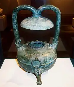 Les inventions de l'ingénieur Ding Huan (丁緩) sont mentionnées dans les Diverses notes sur la capitale occidentale[61]. Le fonctionnaire et poète Sima Xiangru (179–117 av. J.-C.) fait allusion pour la première fois dans ses écrits de l'utilisation par les Chinois d'un encensoir de la forme d'un cardan permettant aux anneaux concentriques de tourner tout en gardant l'ensemble vertical[62]. Toutefois, la première mention explicite d'usage de cardan remonte à l'an 180, lorsque Ding Huan crée un encensoir dont le cardan central permet à l'encens de rester stable même lorsqu'il est déplacé[63],[64] Ding a d'autres trouvailles à son actif. Pour créer de l'air conditionné dans les bâtiments, il met en place un grand ventilateur actionné manuellement, d'une circonférence de 3 m[65]. Il invente également le zootrope. Lorsque la lampe cylindrique est allumée, la convection de l'air chaud vers le haut entraîne les pales placées sur le haut et font tourner l'objet[66],[67].