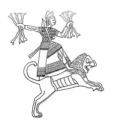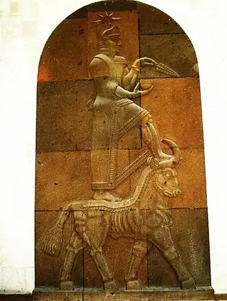 À gauche, statuette du dieu Teisheba, Musée national d'histoire d'Arménie. À droite, Teisheba sur un lion. Dessin sur un bouclier découvert à Anzaf (Turquie). | ||
