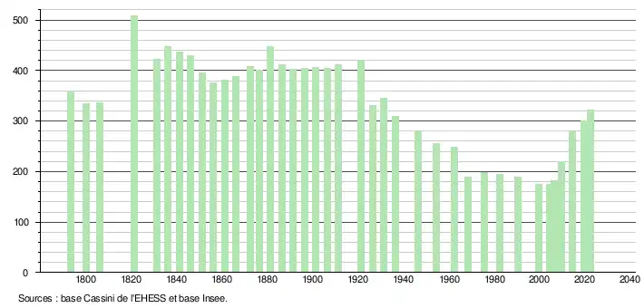 L'évolution du nombre d'habitants est connue à travers les recensements de la population effectués dans la commune depuis 1793. Pour les communes de moins de 10 000 habitants, une enquête de recensement portant sur toute la population est réalisée tous les cinq ans, les populations de référence des années intermédiaires étant quant à elles estimées par interpolation ou extrapolation[13]. Pour la commune, le premier recensement exhaustif entrant dans le cadre du nouveau dispositif a été réalisé en 2004[14].