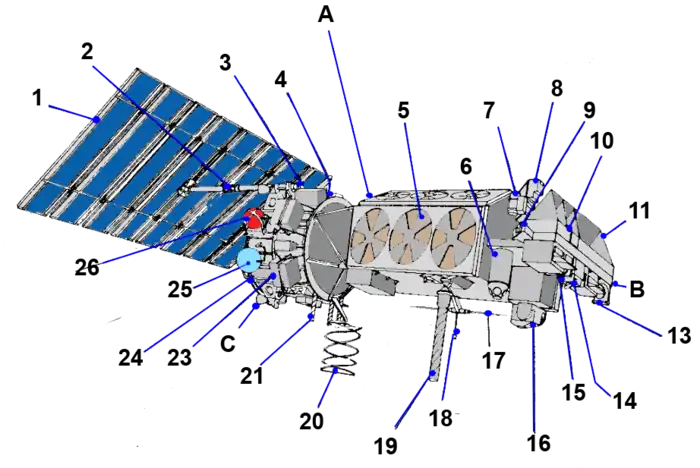 Plusieurs équipements et instruments sont installés seulement sur certains satellites de la série[18],[17] :