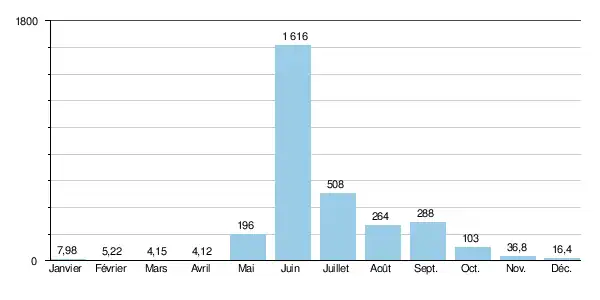 Le débit moyen mensuel observé en avril (minimum d'étiage) est de 4,12 m3/s, soit à peine 0,25 % du débit moyen du mois de juin (1 616 m3/s), ce qui illustre l'amplitude extrêmement élevée des variations saisonnières. Sur la période d'observation de 47 ans, le débit mensuel minimal a été de 0,27 m3/s en , tandis que le débit mensuel maximal s'est élevé à 2 440 m3/s en , plus que le débit moyen du Rhin en fin de parcours.
