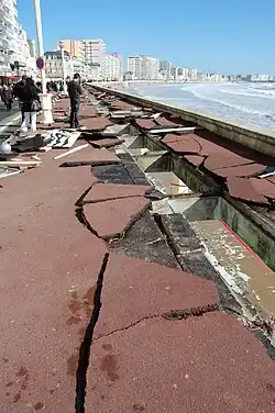La conjonction de la tempête et de la pleine mer, avec des marées de fort coefficient (102), amène à la rupture de plusieurs digues dans maintes localités, conduisant à de fortes inondations dans les départements de Vendée (La Tranche-sur-Mer, L'Aiguillon-sur-Mer, La Faute-sur-Mer)[42], de Charente-Maritime (Aytré, Fouras, Châtelaillon-Plage, Boyardville[43], La Rochelle[44], Charron) ou de Gironde (Andernos-les-Bains, cap Ferret)[45].