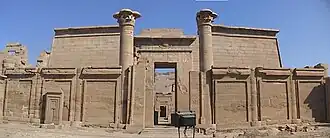 Le naos composé de trois chapelles communiquant entre elles, est précédé d’une salle de la barque qui était autrefois entourée de portiques mais dont la façade a été murée aux époques ultérieures.