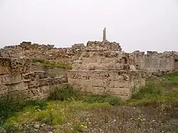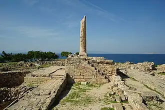 - ↑ « Deux colonnes d'ordre dorique soutenant leur architrave […] sont situées près du bord de la mer. » (Richard Chandler, Voyage en Asie Mineure et en Grèce., 1806, Tome II, p. 312).