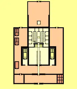 Les fouilles ont révélé plusieurs vastes structures ayant subi des incendies et des destructions. On y a retrouvé en l'occurrence, dans ce qui aurait été une grande cour à portiques, les fameux colosses à l'image du jeune souverain, figuré debout, en position osirienne, portant diverses couronnes dont l'une, celle du dieu Shou, le rattache directement au dieu solaire.