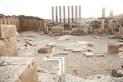 Au nord-est, une construction semi-rectangulaire, dont chaque côté est relié au mur d'enceinte, marque l'entrée principale du sanctuaire. Pour entrer dans la partie sacrée, les visiteurs devaient traverser une première pièce annexe avant d'accéder à une salle plus grande, encadrée par un péristyle de trente-deux colonnes et une série de bancs en pierre volcanique. Les murs du bâtiment, construits avec des blocs de calcaire taillés et disposés de la même façon que pour le mur d'enceinte, sont décorés par des dizaines de fausses fenêtres réparties sur deux niveaux. Une collection de statuettes en bronze et en marbre, pour la plupart incomplètes, ont été trouvées lors des fouilles de l'AFSM en 1951-1952. Malgré le pillage du site sur une très longue période, les nombreuses inscriptions encore lisibles sont étudiées par les épigraphistes modernes, permettant de dater les différentes phases de construction du bâtiment et du temple[1],[6].